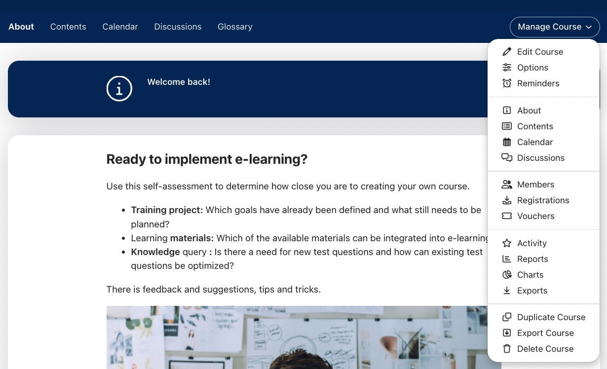 Auf der Kurs-Startseite gibt es ein Dropdown-Menü "Kurs verwalten“ Dieser Button ist auf allen Kursseiten sichtbar, sofern der/die Benutzer*in die entsprechende Rolle und Berechtigung hat.