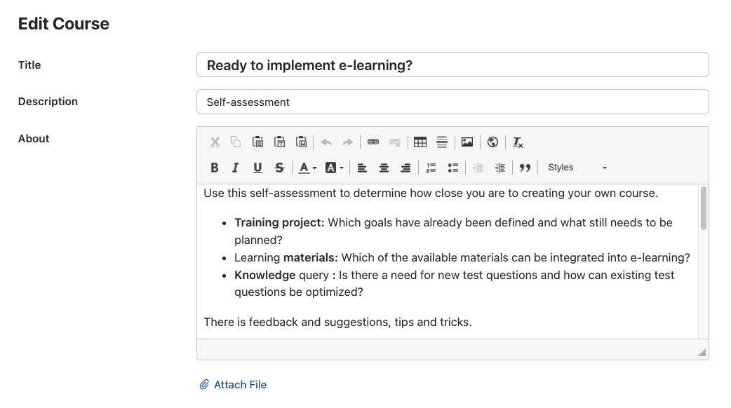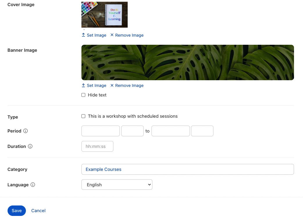 Unter Kurs verwalten > Kurs bearbeiten können Sie weitere Details zum Layout Ihrer Kurs-Startseite einstellen. Wählen Sie hier ein Bild und ein Banner aus, das nicht nur auf dem Kurs-Widget in der Akademiebibliothek, sondern auch auf Ihrer Kurs-Homepage angezeigt wird. Sie können entweder eigene Bilder hochladen oder die integrierte Suche nach Stock-Bildern nutzen. Die Beschreibung, die Sie hier im Textfeld eingeben und die u.a. mit zusätzlichen Bildern angereichert werden kann, wird später auf der Info-Seite Ihres Kurses angezeigt.