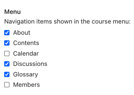 Die Anzeige der Menüpunkte im Kurs, wie z. B. "Inhalt", "Info" usw. können von Ihnen bestimmt werden. Die gewünschten Menüpunkte können Sie unter Kurs verwalten > Optionen > Menü auswählen.