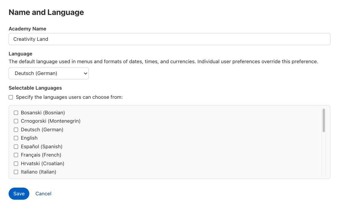 Sie können Ihre Akademie im Setup-Abschnitt Branding unter "Name und Sprache" konfigurieren.