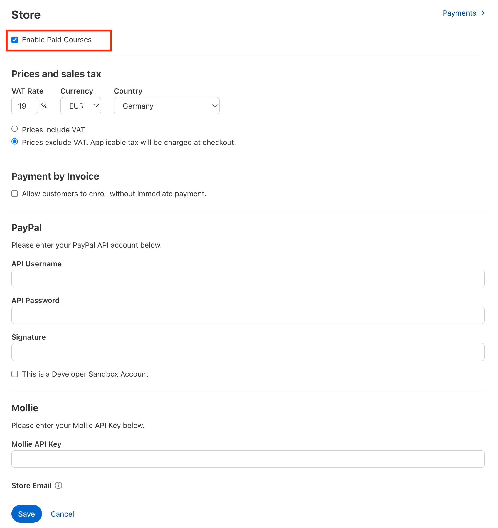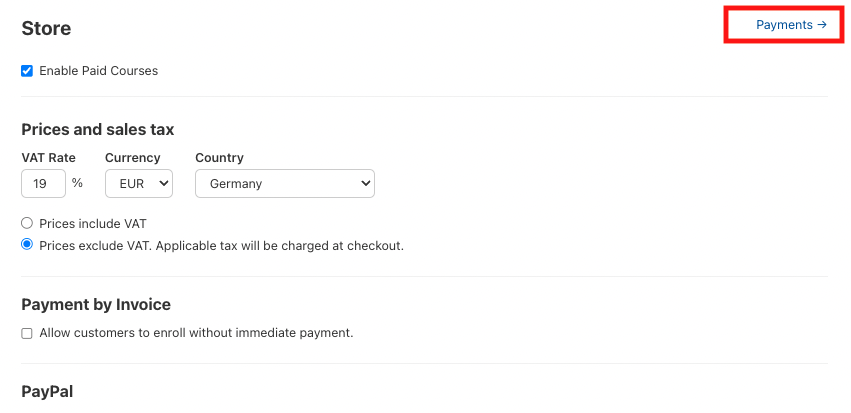 Richten Sie in Ihrer Akademie die Shop-Funktion ein und legen Sie dann je Kurs einen Betrag und die Mehrwertsteuer fest. Sie können Ihren Kunden die Bezahlmöglichkeiten offen halten, sodass diese sich beispielsweise selbst zwischen PayPal und Mollie entscheiden können.