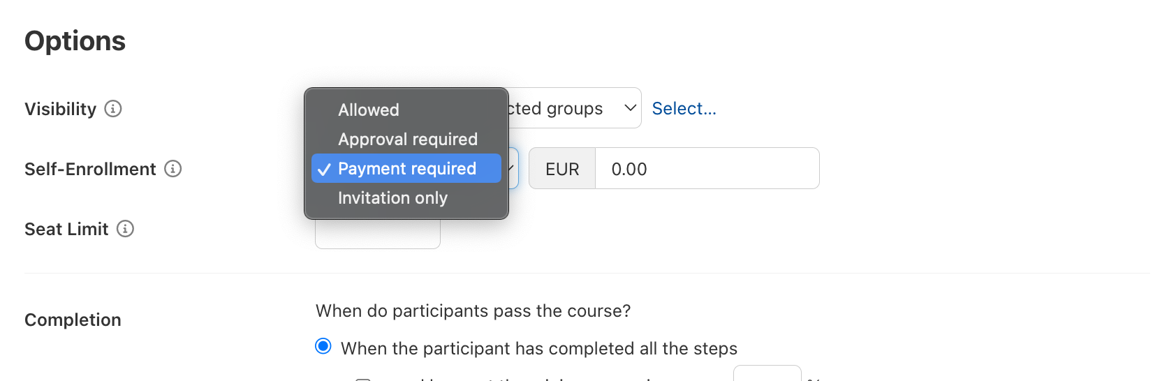 Wichtig: Klicken Sie oben links in das Kästchen: Bezahlte Kurse erlauben.
