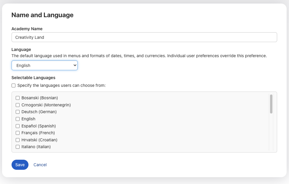Tipp: Manager können festlegen aus welchen der 21 Sprachen in der Akademie ausgewählt werden kann.
