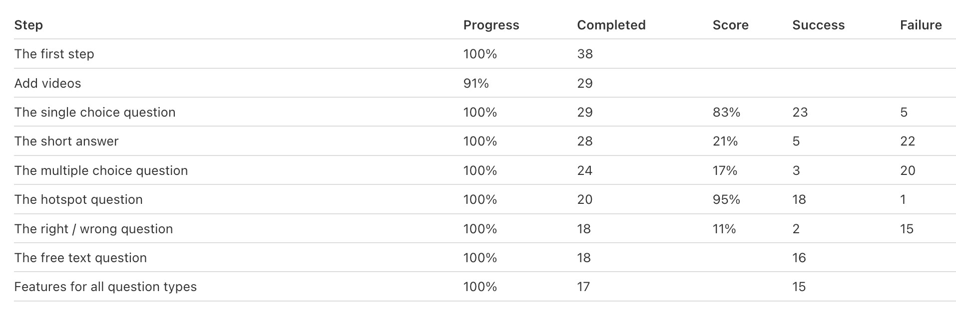 - Die Lernschritt-Performance zeigt die gesamte Anzahl der Abschlüsse und die Durchschnittsergebnisse der ausgewählten Schritte an. Hier sehen Sie, wie viele Schritte abgeschlossen wurden und wie viele Teilnehmer dabei erfolgreich waren oder einen Fehlversuch erlitten haben. Zudem bekommen Sie angezeigt, wie viele Versuche für das Abschließen des Schrittes nötig waren und wo der Durchschnittswert der Versuche für alle Schritte liegt.