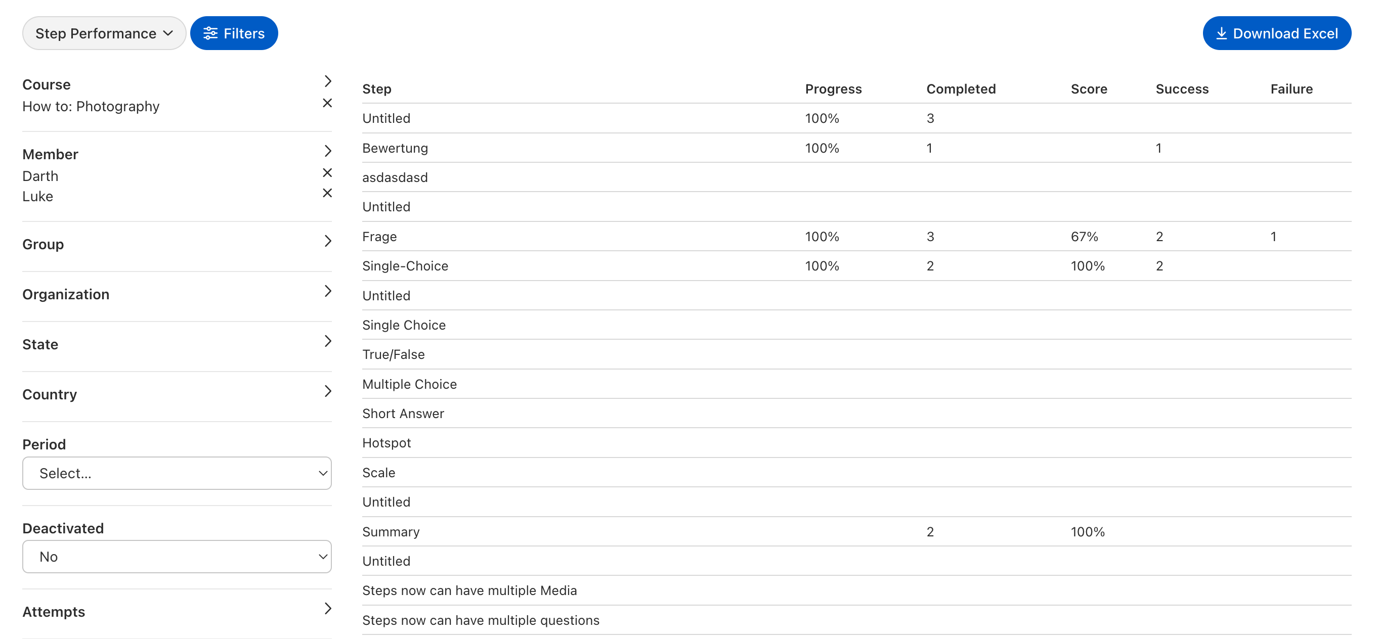 Eine Vielzahl an Filter-Optionen ermöglicht einen ganz genauen Vergleich verschiedener Zielgruppen, z. B. Teilnehmern einer bestimmten Lernsequenz. So können nicht nur die detaillierten Fortschritte eines ganzen Kurses angezeigt werden, sondern auch die eines einzelnen Teilnehmers oder eines einzelnen Lernschritts.