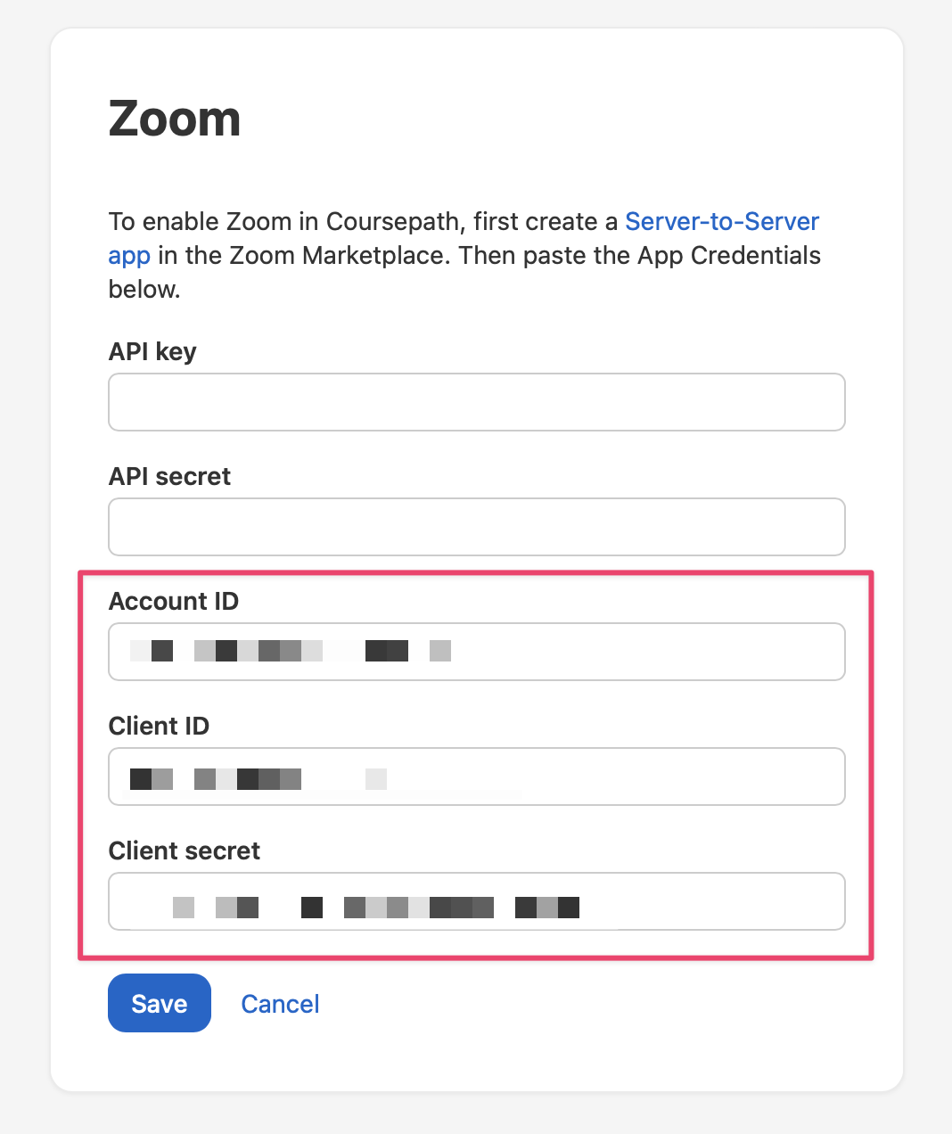 Fügen Sie die von Zoom zur Verfügung gestellten Werte für Account ID, Client ID und Client Secret in das Dialogfeld in Coursepath ein und klicken Sie auf Speichern. Sie finden diese Daten (Integrationsauthentifizierung) in Ihrem Zoom-Konto unter Einstellungen > Meeting > Andere.