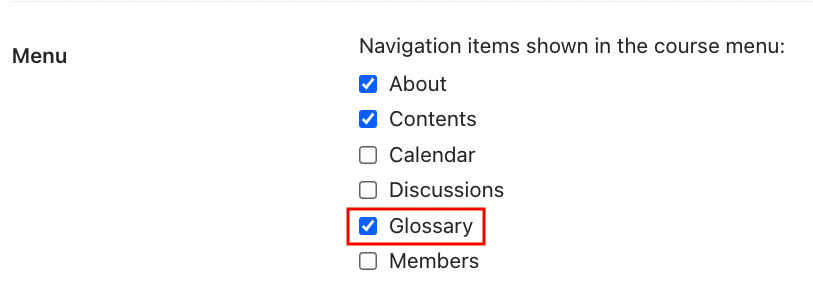 Über die Kurs-Einstellungen gelangen Sie zu den Optionen. Hier lassen sich die unterschiedlichen Elemente im Kursmenü freischalten. Setzen Sie das Häkchen bei Glossar.