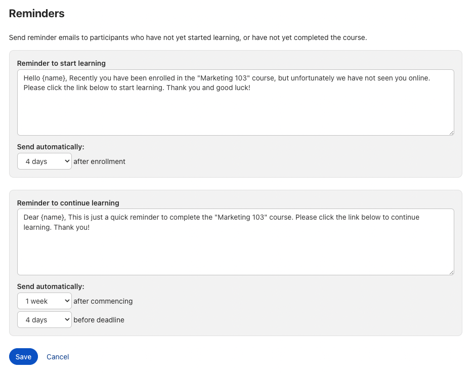 Erinnerungsnachrichten können frei angepasst werden. Im Text können Sie auch Variablen wie z. B. {name} oder {deadline} (Hier wird das Datum der Kurs-Deadline angezeigt) verwenden.