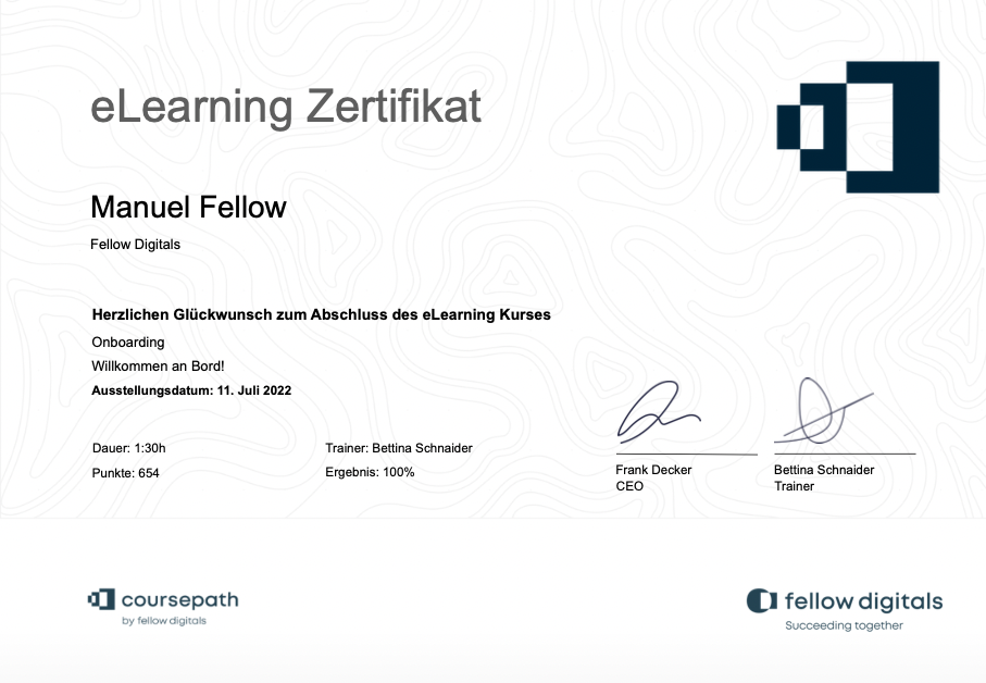 Die von Ihnen vorbereiteten Zertifikate werden den Teilnehmern nach erfolgreichem Abschluss des Kurses automatisch als PDF-Datei zum Download zur Verfügung gestellt. Entsprechend der von Ihnen gesetzten Variablen können die Teilnehmer sich so selbständig ihr individuelles Kurszertifikat herunterladen.