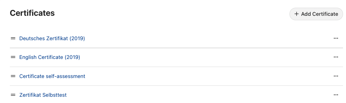 Zertifikatsübersicht mit Deutschen und Englischen Zertifikaten