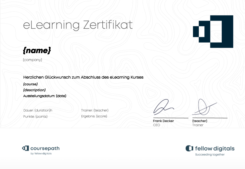 Diese Variablen werden von Coursepath automatisch erkannt und durch die entsprechenden Werte ersetzt. So wird beispielsweise {name} durch den in Coursepath hinterlegten Namen des jeweiligen Kursteilnehmers ersetzt. Textelemente ohne {Klammer} werden für alle Kursteilnehmer automatisch auf den Zertifikaten übernommen.