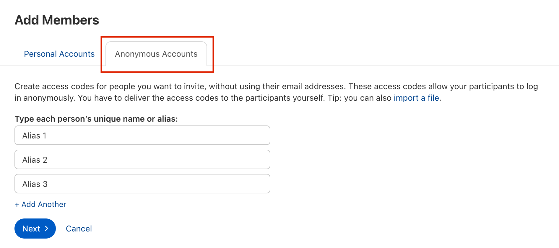 Als Manager in einer Akademie können Sie eine beliebige Anzahl anonymer Nutzerkonten generieren. Standardmäßig sind Nutzerkonten mit einer E-Mail-Adresse verknüpft, um einen Austausch zwischen Trainern und Teilnehmern zu gewährleisten. Per E-Mail werden Teilnehmer über Kurseinladungen, Erinnerungsnachrichten und weitere Kurs-Benachrichtigungen wie z. B. Kommentare informiert. Wo aber absolute Anonymität erforderlich ist oder es einfach keine E-Mail-Adresse gibt, sollte oder kann eine persönliche E-Mail-Adresse nicht mit einem Nutzerkonto verknüpft werden. Hier kommen Zugangscodes ins Spiel: Erstellen Sie Konten ohne E-Mail-Adressen oder Namen. Statt Namen können Sie auch Alias oder Nummern einsetzen. Damit können Sie außerhalb von Coursepath die Zuordnung von Ergebnissen vornehmen.