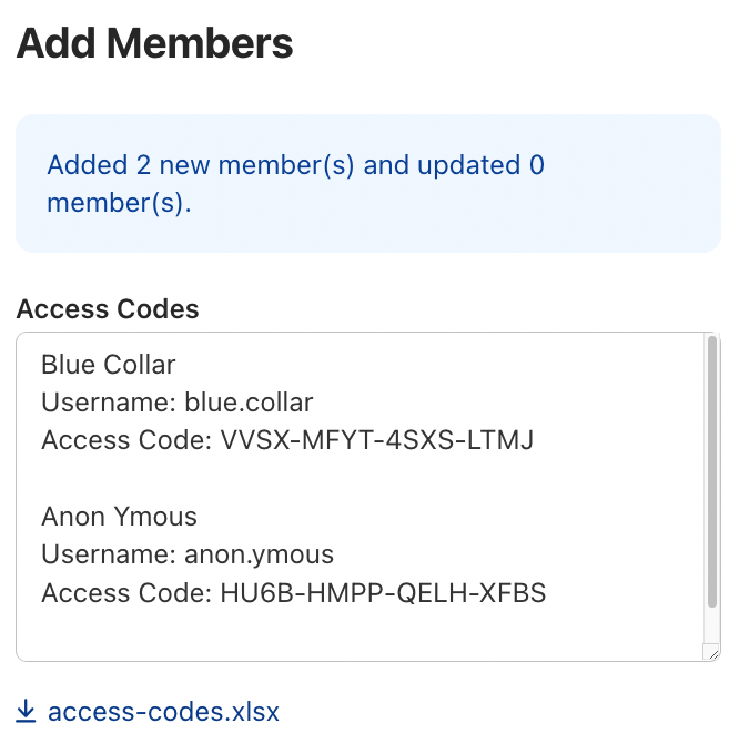 Nach Eingabe der Namen erhalten Sie die Zugangscodes. Wenn Sie mehrere anonyme Konten auf einmal anlegen möchten, laden Sie eine Excel-Datei mit den entsprechenden Stammdaten hoch.