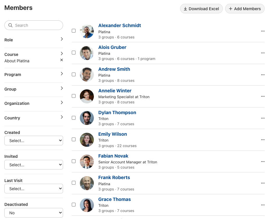 In jeder Mitgliederübersicht können Sie Mitglieder auswählen. In Kombination mit der integrierten Suchfunktion, wird diese Funktion noch nützlicher. Suchen Sie beispielsweise nur nach Mitgliedern, die einen Kurs bestanden haben und laden Sie sich anschließend eine praktische ZIP-Datei mit den Zertifikaten herunter. Weitere Suchfilter sind z. B. Bestanden, Gruppen oder Rollen.