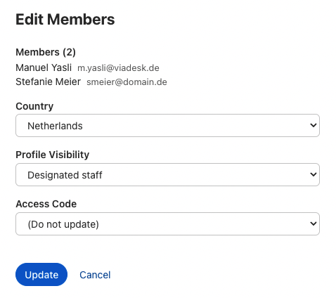 Markieren Sie mehrere Nutzer und wählen dann unten "Eigenschaften aktualisieren" aus. Im nächsten Schritt können Sie dann das Land, die Profil-Sichtbarkeit und bei anonymen Konten, den Zugangscode zurücksetzen. Letzteres macht Sinn, wenn ein Teilnehmer das Passwort vergessen hat. Mit dem neuen Zugangscode kann dann ein neues Passwort gewählt werden.
