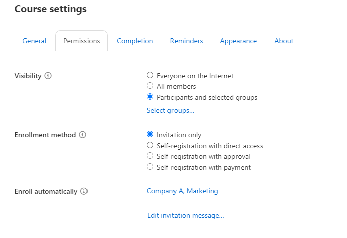Ab dem 3. Oktober ist es auch möglich, Gruppen automatisch in einen Kurs auf Gruppenebene einzuschreiben. Im neuen Berechtigungs-Tab (siehe unten) können Sie die Gruppen festlegen, die automatisch in den Kurs eingeschrieben werden sollen.
