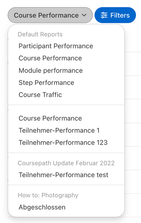 Einen so abgespeicherten Bericht können Sie über das Dropdown-Menü in den Berichten jederzeit wieder aufrufen. Die gespeicherten Berichte sind hier nach den Kursen gegliedert, auf die sie sich beziehen. Berichte, die mehr als nur einen speziellen Kurs beinhalten, sind in der Auflistung direkt unter den vorgefertigten Berichten zu finden.