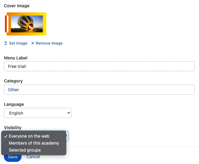 Wählen Sie, ob die Akademie-Seite nur für Mitglieder dieser Akademie, bestimmte Gruppen innerhalb der Akademie oder aber öffentlich zugänglich ist.