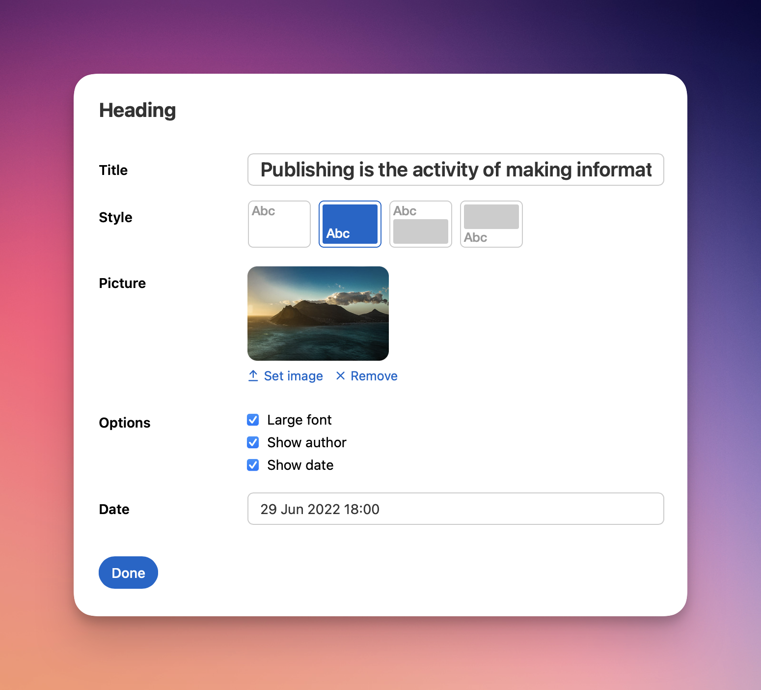 Neben einem einfachen Titel können Sie auch einen Imageheader mit Titel, Autor und Veröffentlichungsdatum innerhalb oder außerhalb des Bildes hinzufügen.