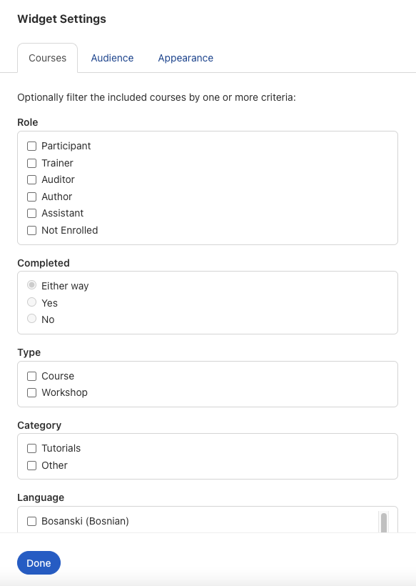 Statt allen Mitarbeitern die gleichen Kurse anzuzeigen, können Sie Widgets nach Sprache anlegen. So werden beispielsweise den französischsprachigen Mitarbeitern nur französische Kurse angezeigt, nicht aber die deutschen oder niederländischen.