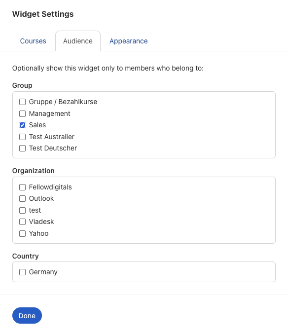 Nutzen Sie hierfür z. B. Gruppen und legen Sie pro Abteilung eine Gruppe an. So können Sie anschließend beim Anlegen des Widgets zusätzlich in der Registerkarte „Zielgruppe“ z. B. die Gruppe Sales auswählen. Das so gefilterte Widget wird dann nur den Mitgliedern angezeigt, die in der Sales-Gruppe sind.