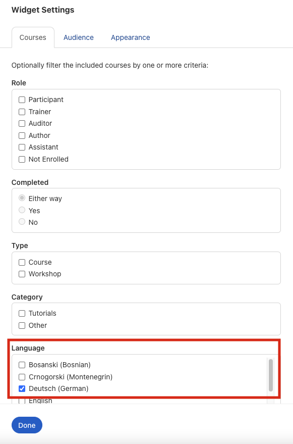 Hierzu wählen Sie beim Anlegen des Widgets in der Registerkarte „Inhalt“ die entsprechende Sprache aus. Sie können eine oder mehrere Sprachen auswählen. In der angelegten Rubrik werden auf der Startseite dann die Kurse angezeigt, in deren Einstellungen die entsprechende Sprache eingestellt ist. Die Ansicht erscheint unabhängig von den Spracheinstellungen für die Akademie oder der gewählten Akademiesprache der Mitglieder.