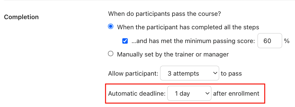 Onder Cursus beheren > Opties vind je de instelling “Automatische deadline”. Hiermee kun je instellen hoe lang een cursist toegang moet hebben tot de cursus. Als je bijvoorbeeld 1 dag instelt, zal de deelnemer voor één dag toegang hebben tot de cursus. Daarna heeft de deelnemer geen toegang meer tot de cursus.