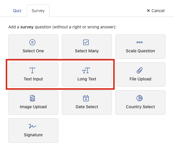 Lange-tekst-vragen bieden je veelzijdige mogelijkheden om de kennis van jouw cursisten te testen. Maak een nieuwe cursus-stap, bewerk deze en ga dan naar het tabblad “Vraag toevoegen” (te vinden in de blauwe menubalk helemaal bovenaan).