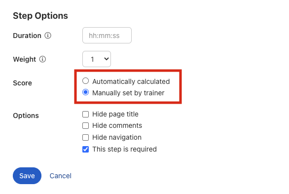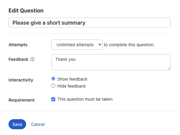 Let op: In de cursus-stap in de bovenste blauwe menubalk moet je “Handmatige vrijgave door trainer” instellen, zodat een trainer de antwoorden kan beoordelen.