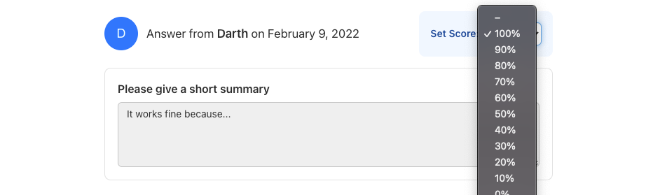 Nadat de deelnemers de lange-tekst-vraag hebben beantwoord, is het aan jou als trainer om het antwoord of het geüploade bestand te bekijken en te beoordelen. Dit is bij deze vraagsoort altijd zo, omdat Coursepath zoals hierboven vermeld niet kan “weten” of het gegeven antwoord wel of niet correct is.