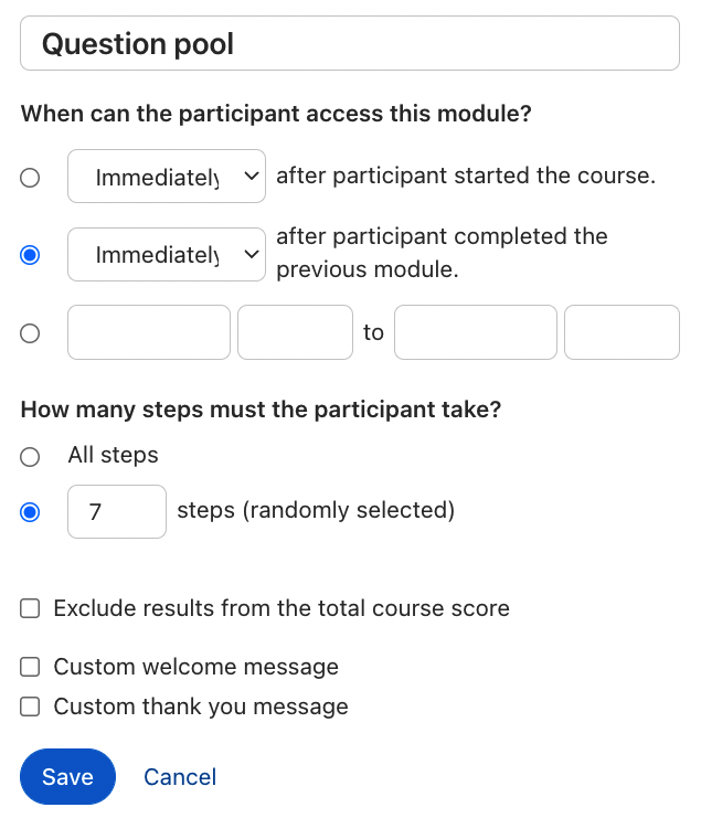 Als er bijvoorbeeld 20 vragen in deze module zitten, krijgt elke deelnemer een willekeurige selectie van 7 van deze 20 vragen.