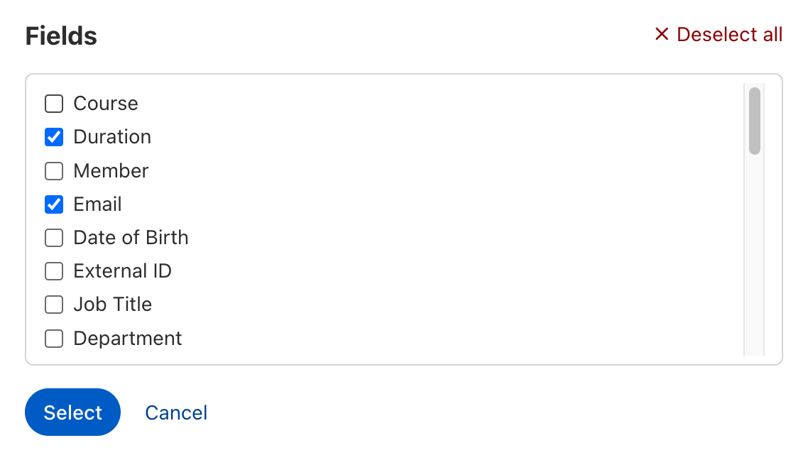 Tip: Dek gevoelige gegevens eenvoudig af met behulp van geschikte filters, inclusief velden (kolommen in de Excel-download). Elke unit- of afdelingsmanager ontvangt zo een individueel rapport met de deelnemers- en voortgangsgegevens van zijn of haar eigen team of afdeling. Mensen van andere afdelingen krijgen deze gegevens niet te zien.