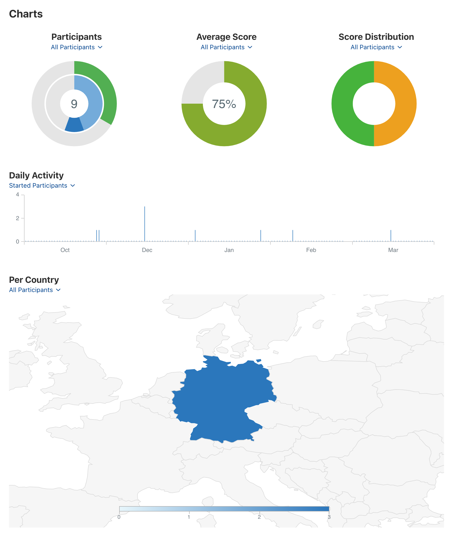Als jouw deelnemers uit verschillende landen komen, krijg je via de wereldkaart inzicht in de onderstaande punten. Beweeg gewoon de muis over het gewenste land en bekijk per land: